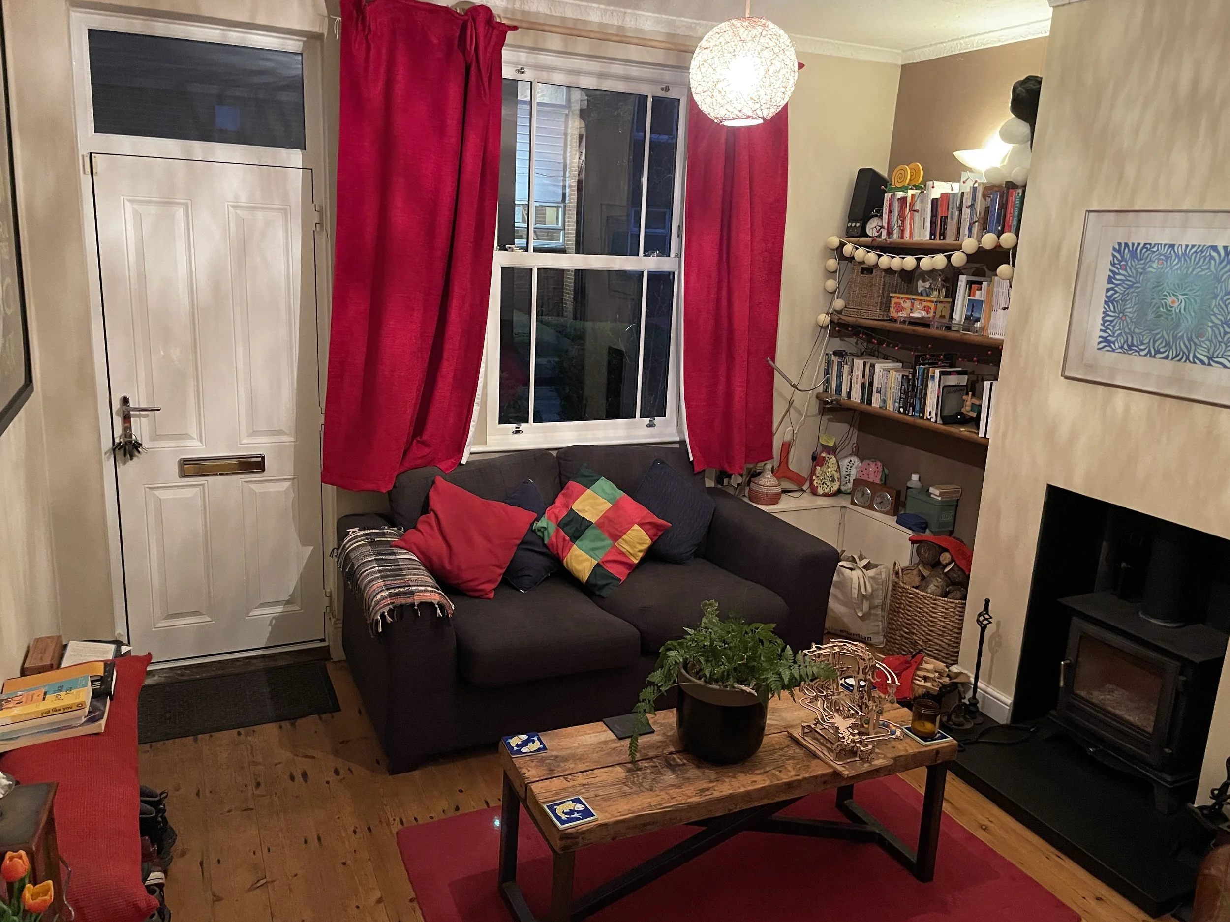 To update and modernise his living room, whilst still maintaining his vintage and industrial furniture. My client has a love for reading, and so did not want a TV in this room. He wanted a space where he could sit in the daytime and read books and drink coffee, but also a space that he could welcome friends back to in the evening. Originally my client wanted a dark blue living room, however due to the size of the room and orientation of the sun I recommended a stone coloured room with accents of more uplifting colours such a orange, yellow and green.