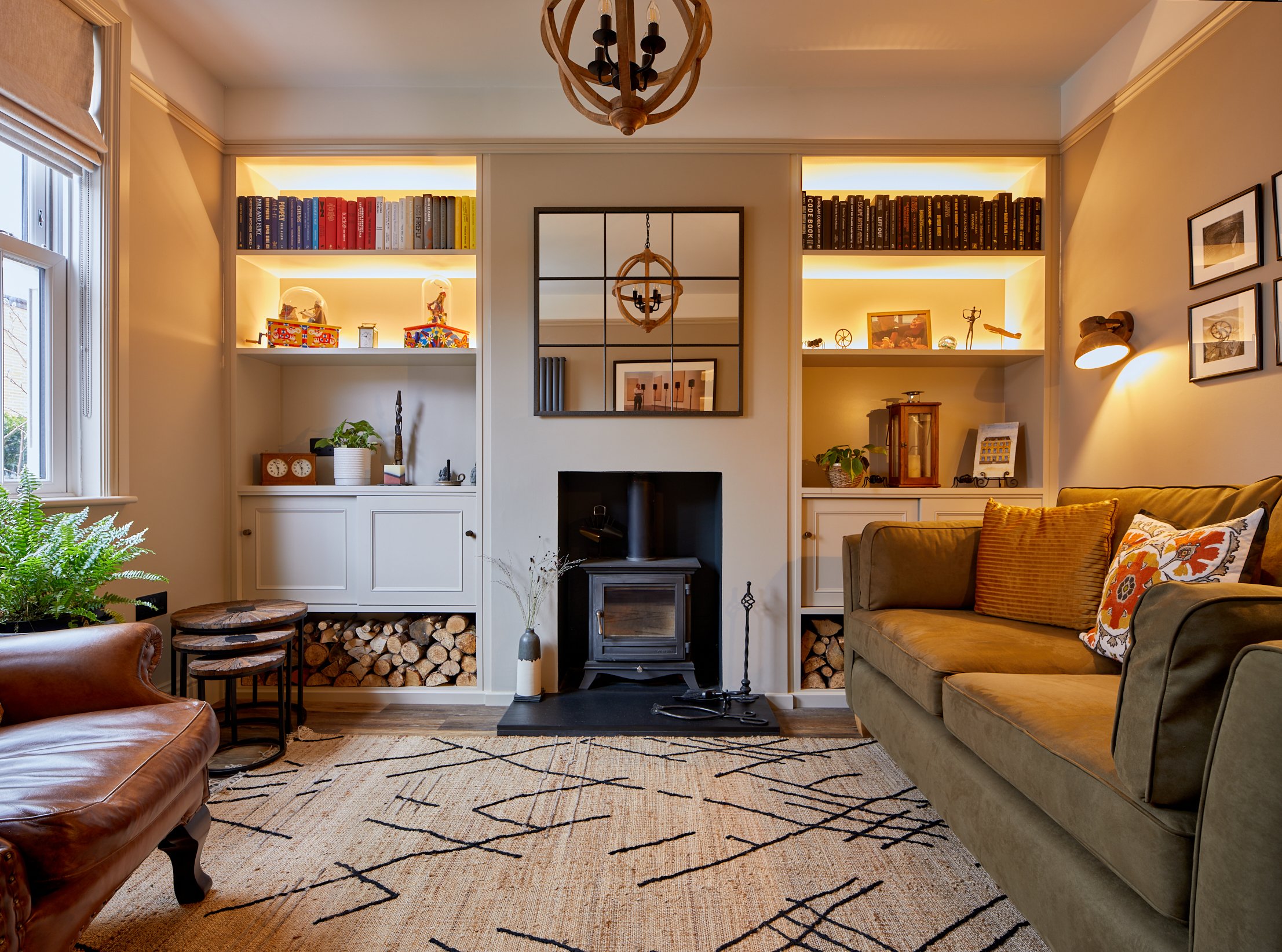 To make the room feel more spacious I designed built in cabinetry with uplighting in the shelves. The doors were sliding rather than hinging to maximise the floor space. I added a space underneath for log storage so that the logs could be used as a display piece as well as for the fire. I re-positoned the sofa opposite the window to maximise the view outside, and repositioned the radiator behind the front door so to maximise the useable wall space.