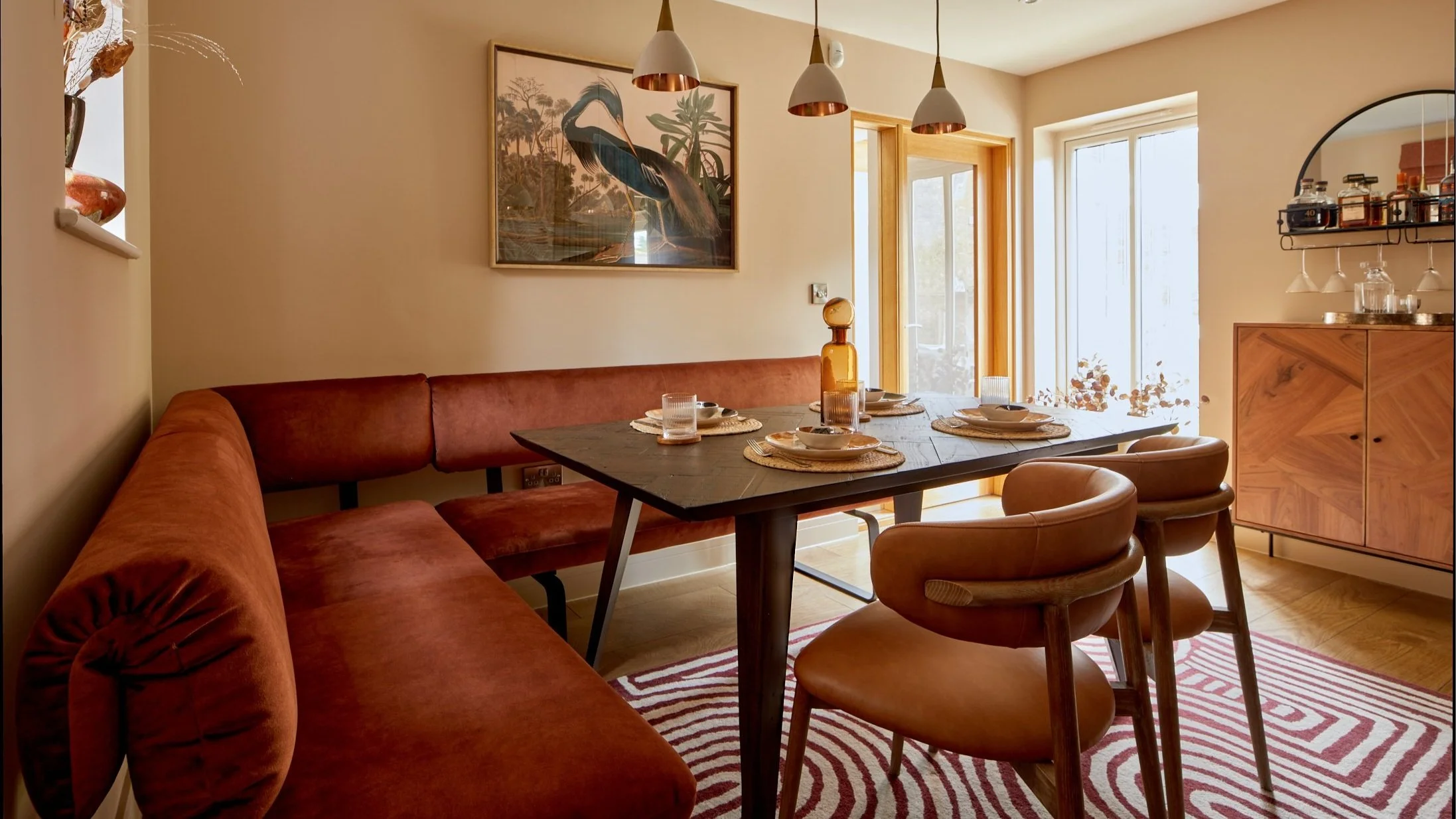 The colour palette for this room was to harmonise with the living room, and so the colours chosen here were all within the warm neutral palette with pops of terracotta, ochre and burnt umber.